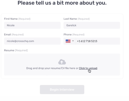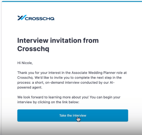 You’ll receive an email from Crosschq with a link to your interview. Click the Take Interview button in the email to begin.