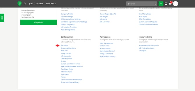 Access the Settings section of the SmartRecruiters admin facility, locate the Job Fields link within the Configuration section, and click it.