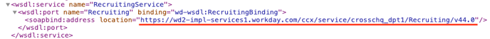 - Within the "soapbind:address" tag, copy the entire location URL minus the quotes. The URL should resemble something similar to https://wd2-impl-services1.workday.com/ccx/service/crosschq_dpt1/Recruiting/v44.0.