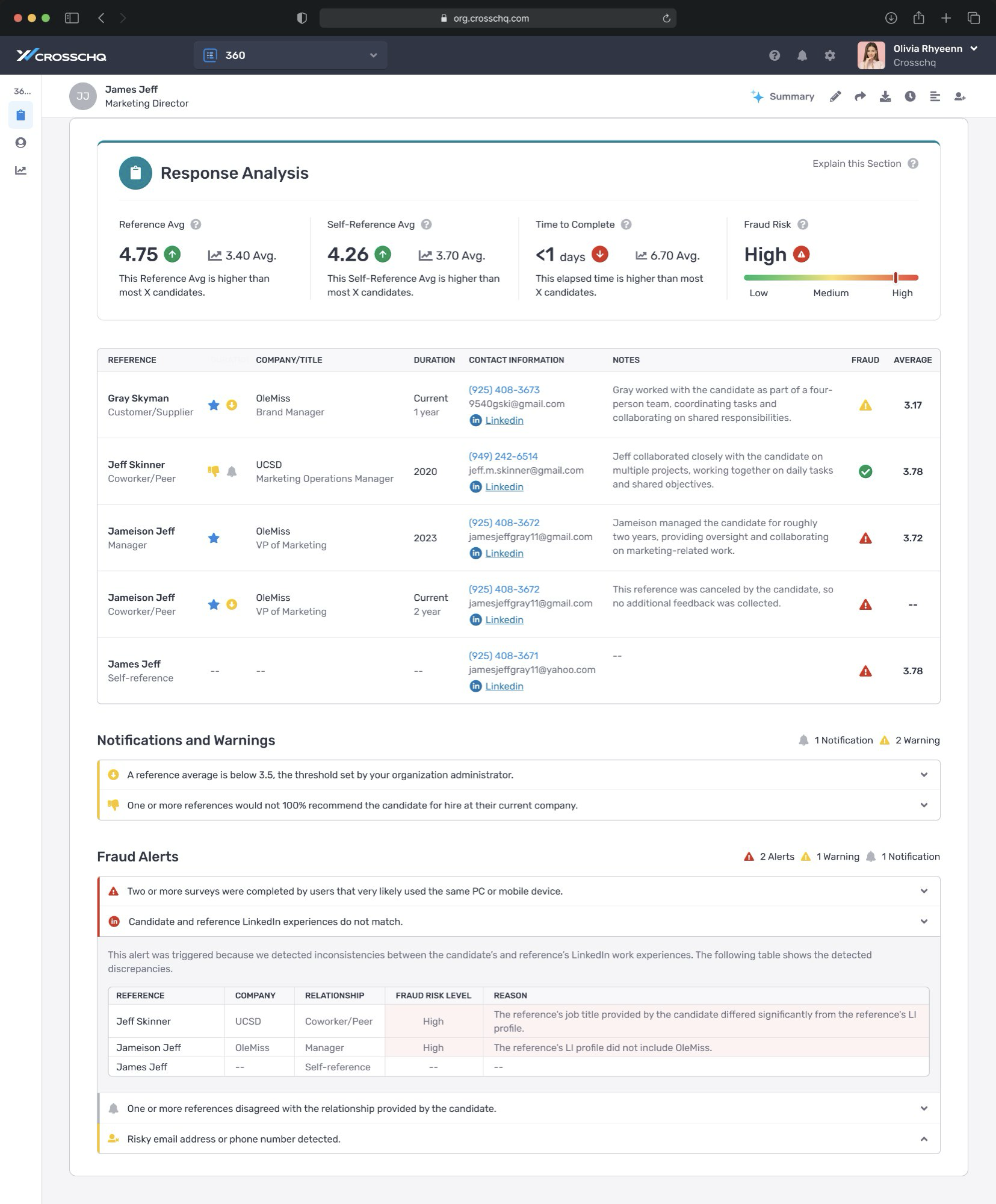 If you have questions about a specific fraud alert on a candidate report, or want guidance on how to interpret a high-risk result, contact Crosschq Support at support@crosschq.com.