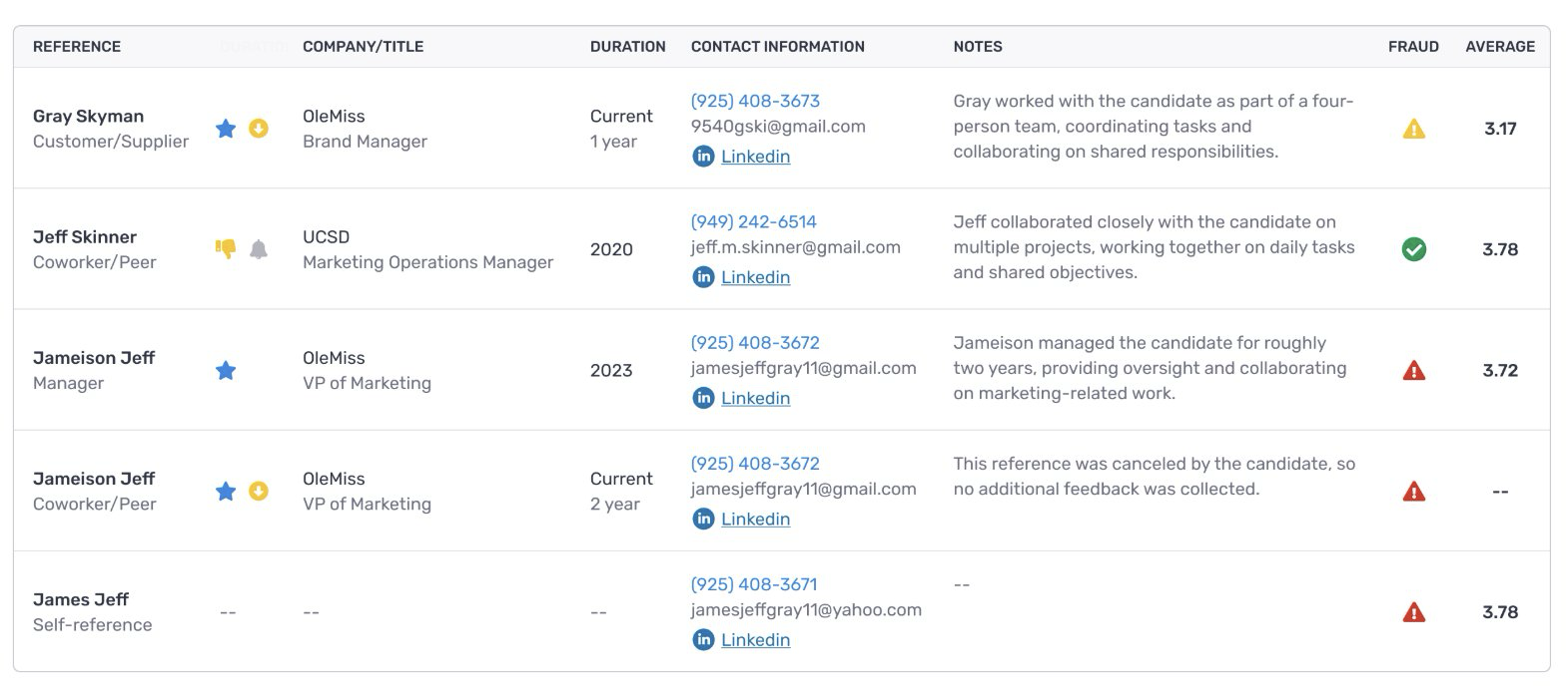 - LinkedIn mismatches: Consider whether the discrepancy has a reasonable explanation (e.g., a recently changed title, or a company listed under a slightly different name). When in doubt, follow up with the reference.