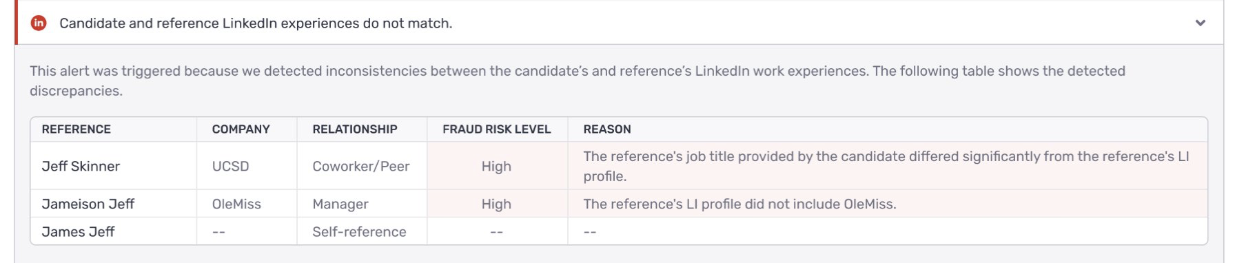 The LinkedIn mismatch alert, expanded to show which references triggered a flag, the specific company, the detected risk level, and the reason for the discrepancy.