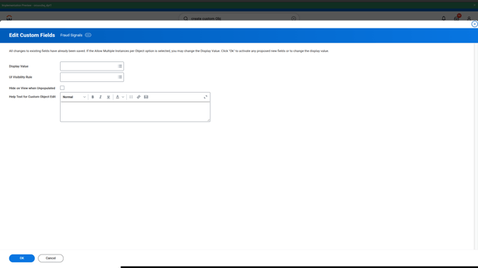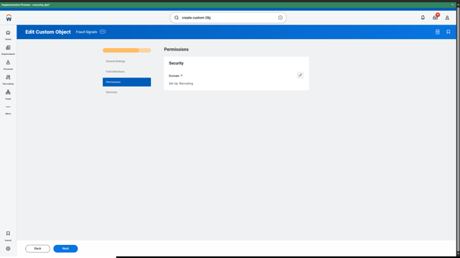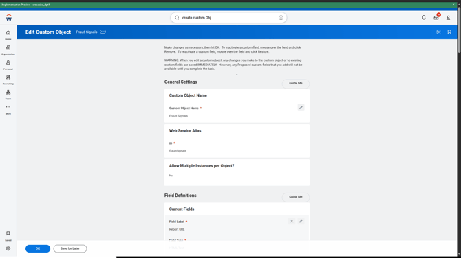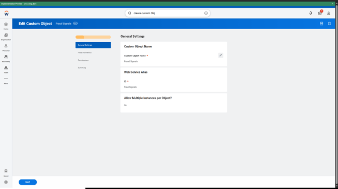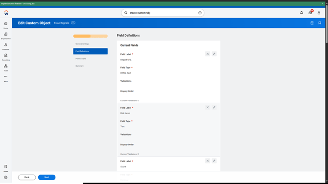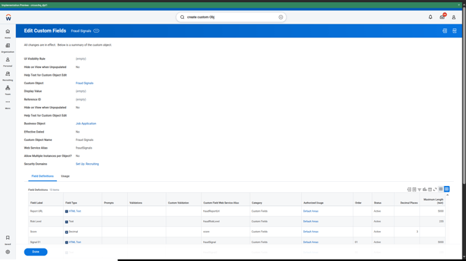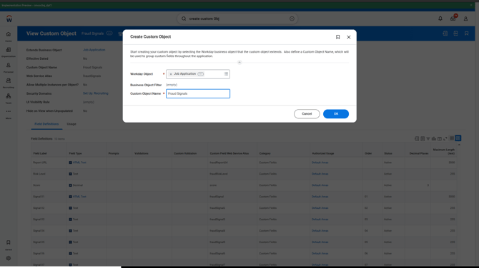 In the Workday Object field, select Job Application. Set the Custom Object Name to Fraud Signals.