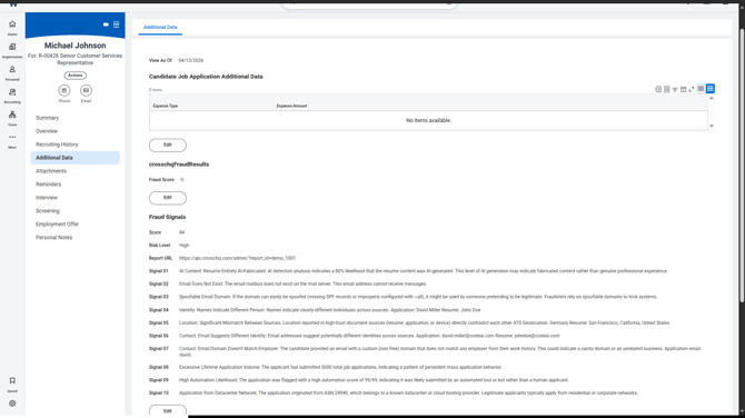 When a job application is flagged as potentially fraudulent, the relevant signal fields will be automatically populated with all identified risk indicators, prioritized by severity — from the most critical to the least. In cases where no fraud is detected, a summary of the security checks and modules evaluated during the analysis will be provided for full transparency.