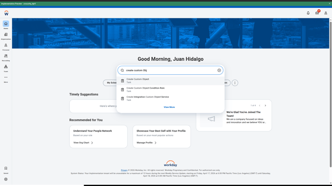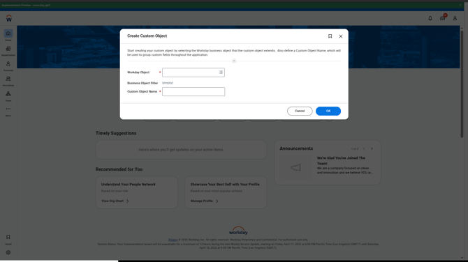 Log in to your Workday account and search for and open the task Create Custom Object.