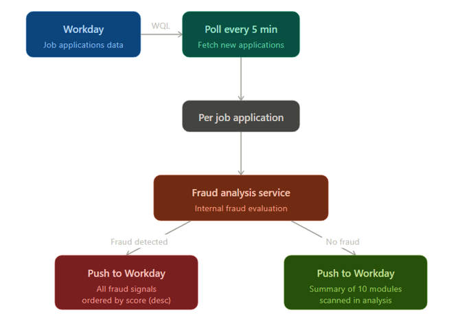 Every 5 minutes, our system automatically reviews all incoming job applications to ensure the integrity of your hiring process. Each application is individually assessed by our fraud detection engine, which analyzes a comprehensive set of risk signals.